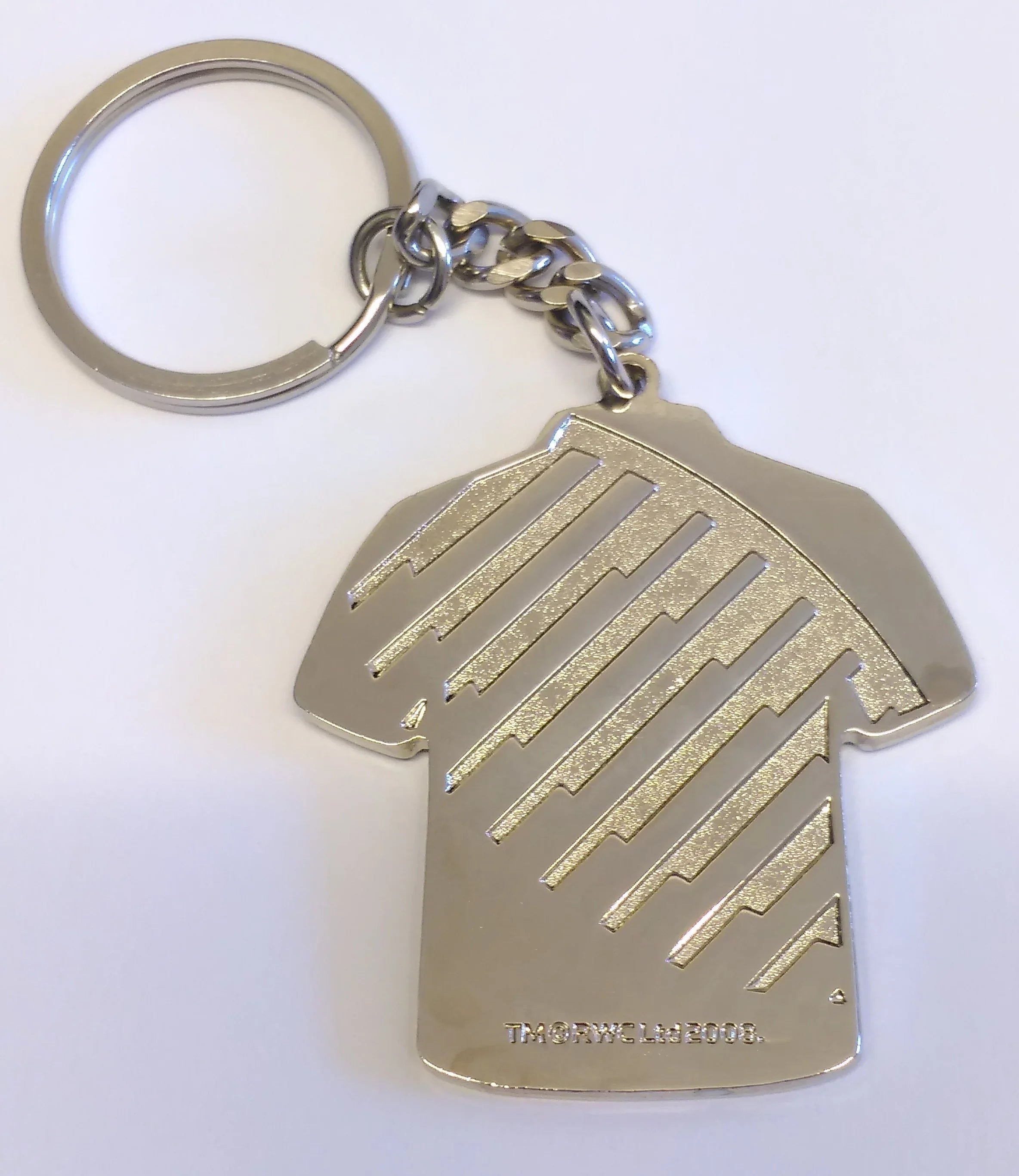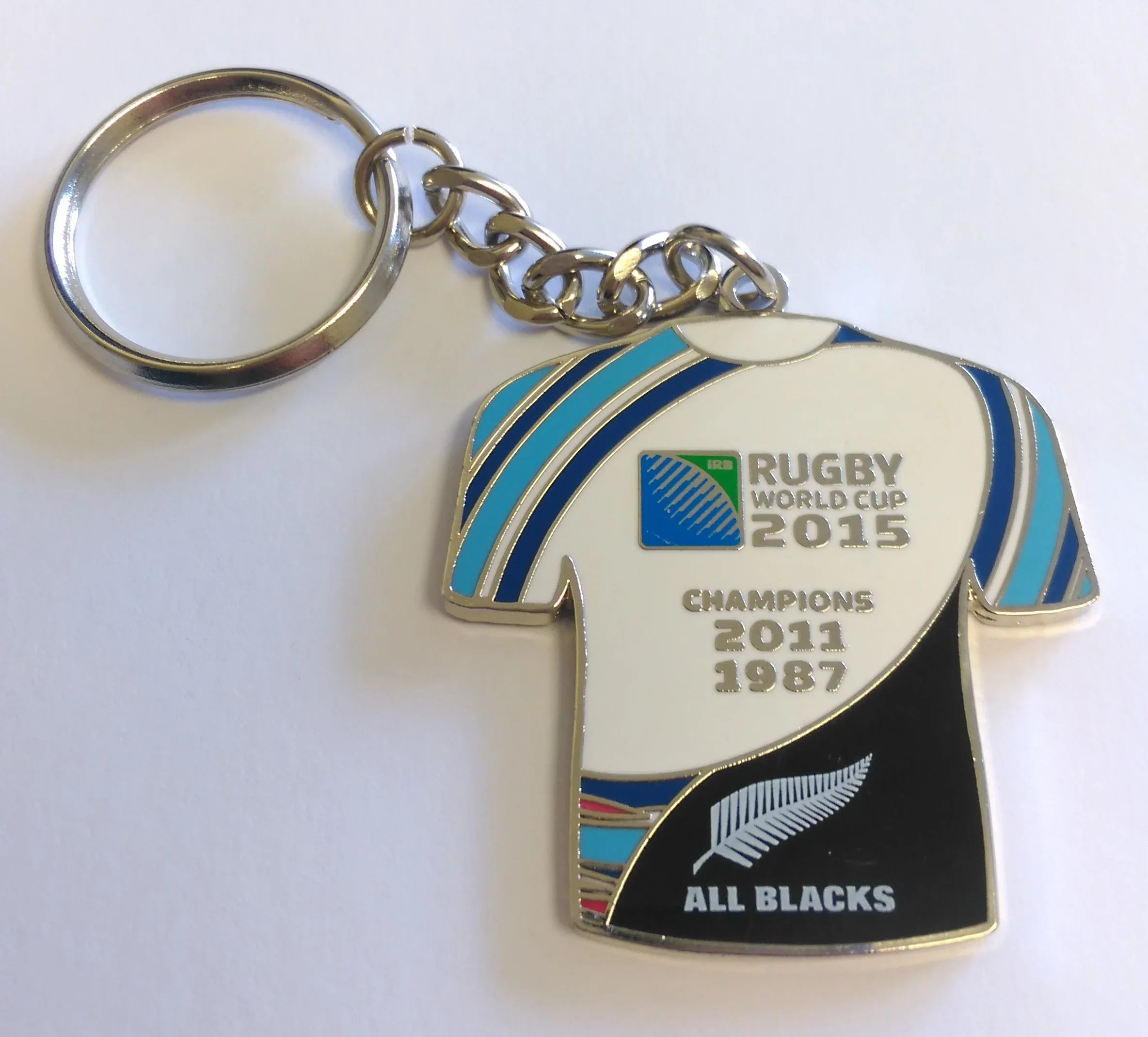 Show your support for reigning Rugby World Cup Champions, the New Zealand All Blacks. This jersey shaped keyring has the All Blacks logo on the front with the RWC 2015 logo and the years they were crowned champions. Also, on the back is an engraved IRB logo.