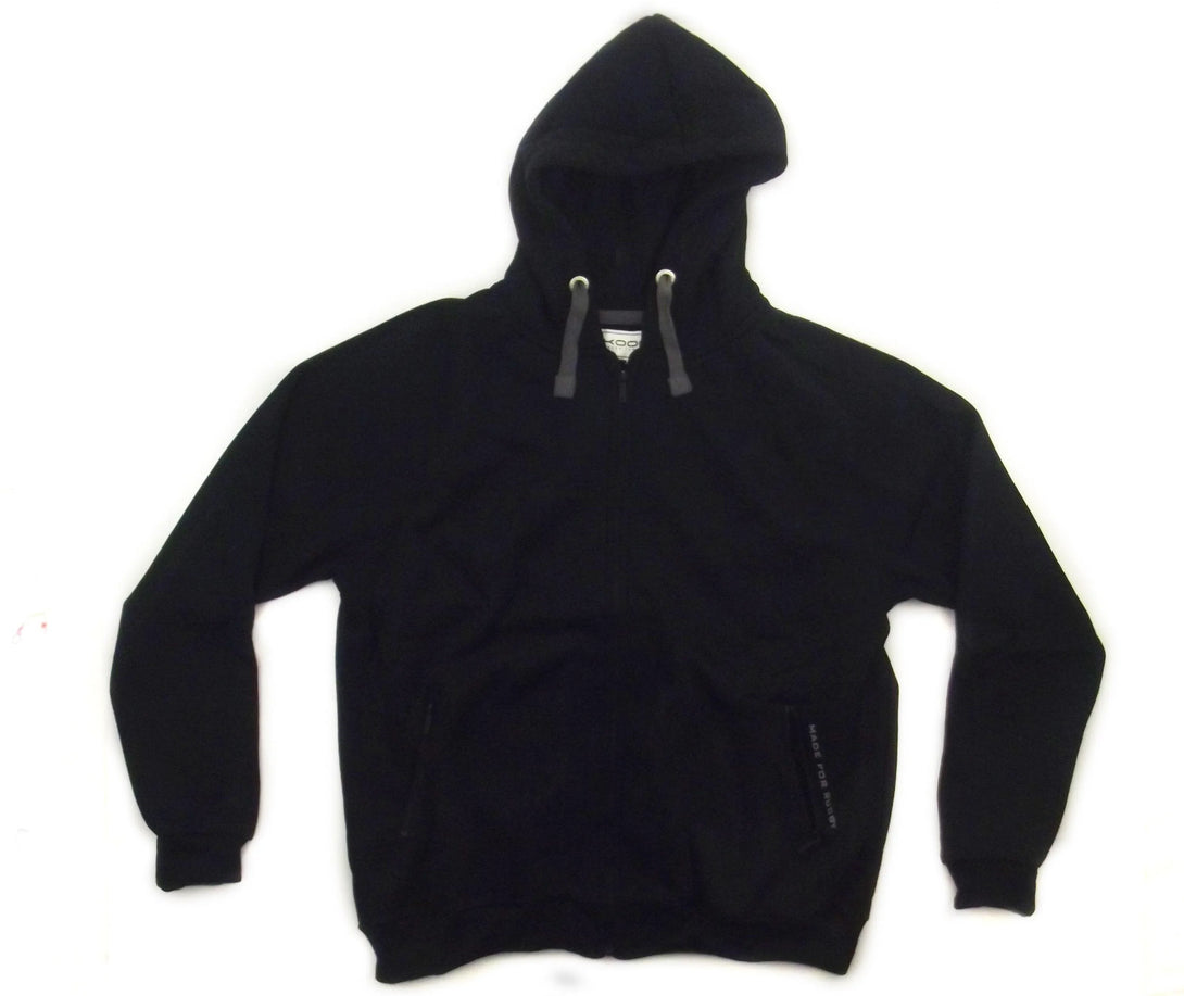 Black zip thru hoody created by Kooga for their 2015 leisure range. This stylish hoody comes in black with the Kooga logo printed in black on the sleeve. The hoody is full zipped and features 2 zipped pockets and neck draw cord. The words Made for rugby can be found on the left pocket. The hoodys thick material will keep you warm on a cold day. This quality garment is the perfect leisure wear item for any rugby fan.