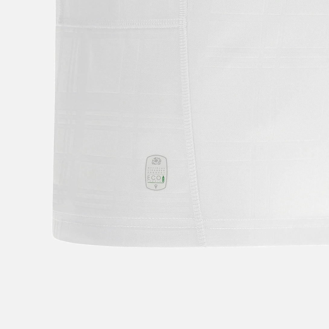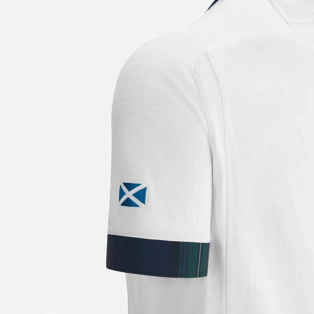 Rugby World Cup 2023 away replica shirt - white relaxed fit shirt with white tone on tone tartan embossed throughout, navy collar and cuffs and embroidered Scotland Rugby and RWC France 2023 crests.